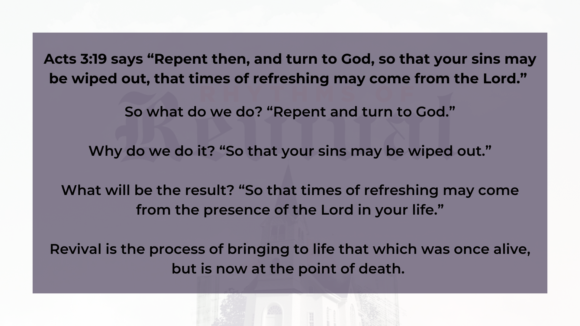 Do you still want revival? Will you pay the price by humbling yourself, repenting and turning back to God? If you do, a refreshing will be on its way to revive not only you, but hopefully this city.
